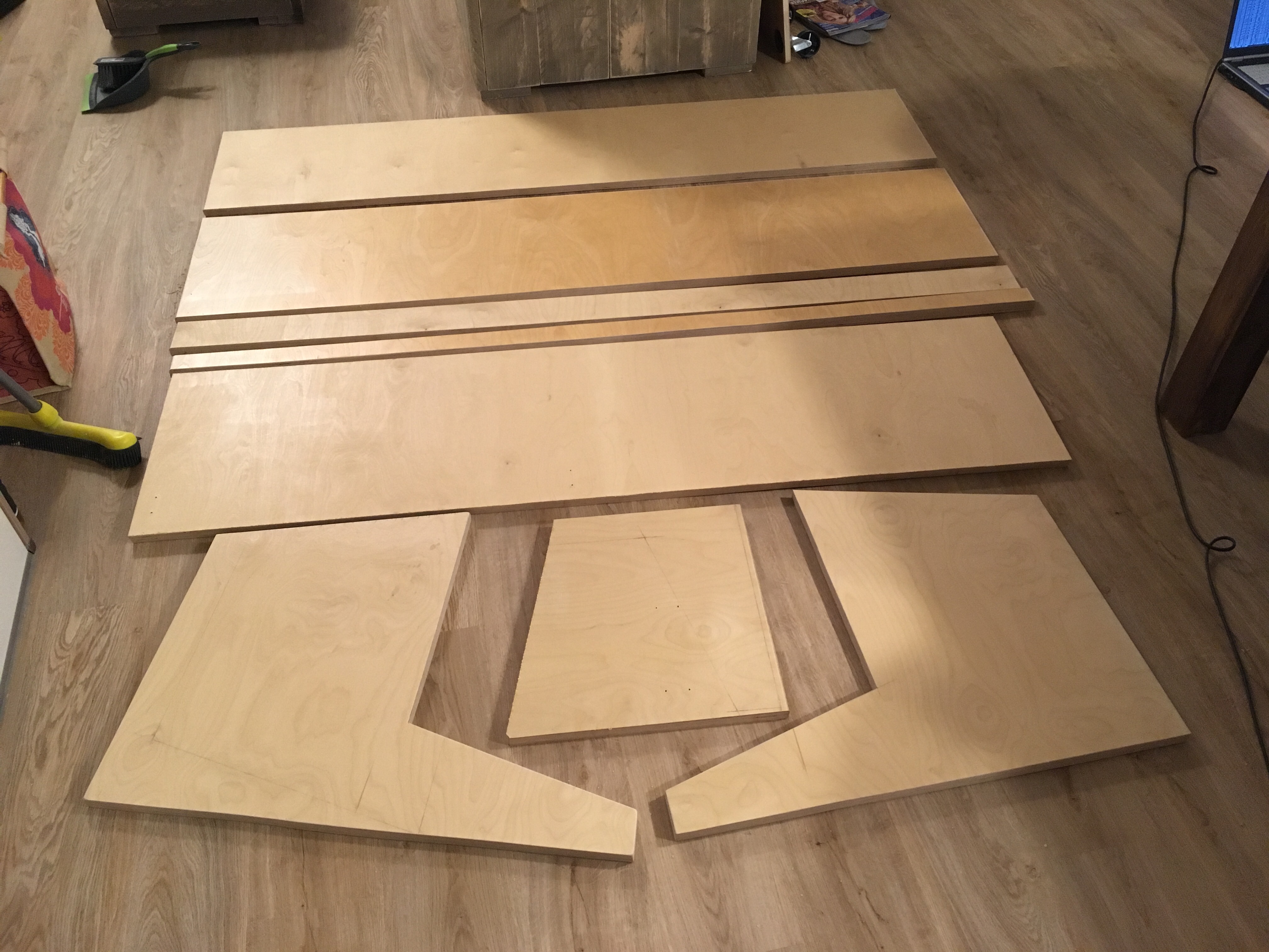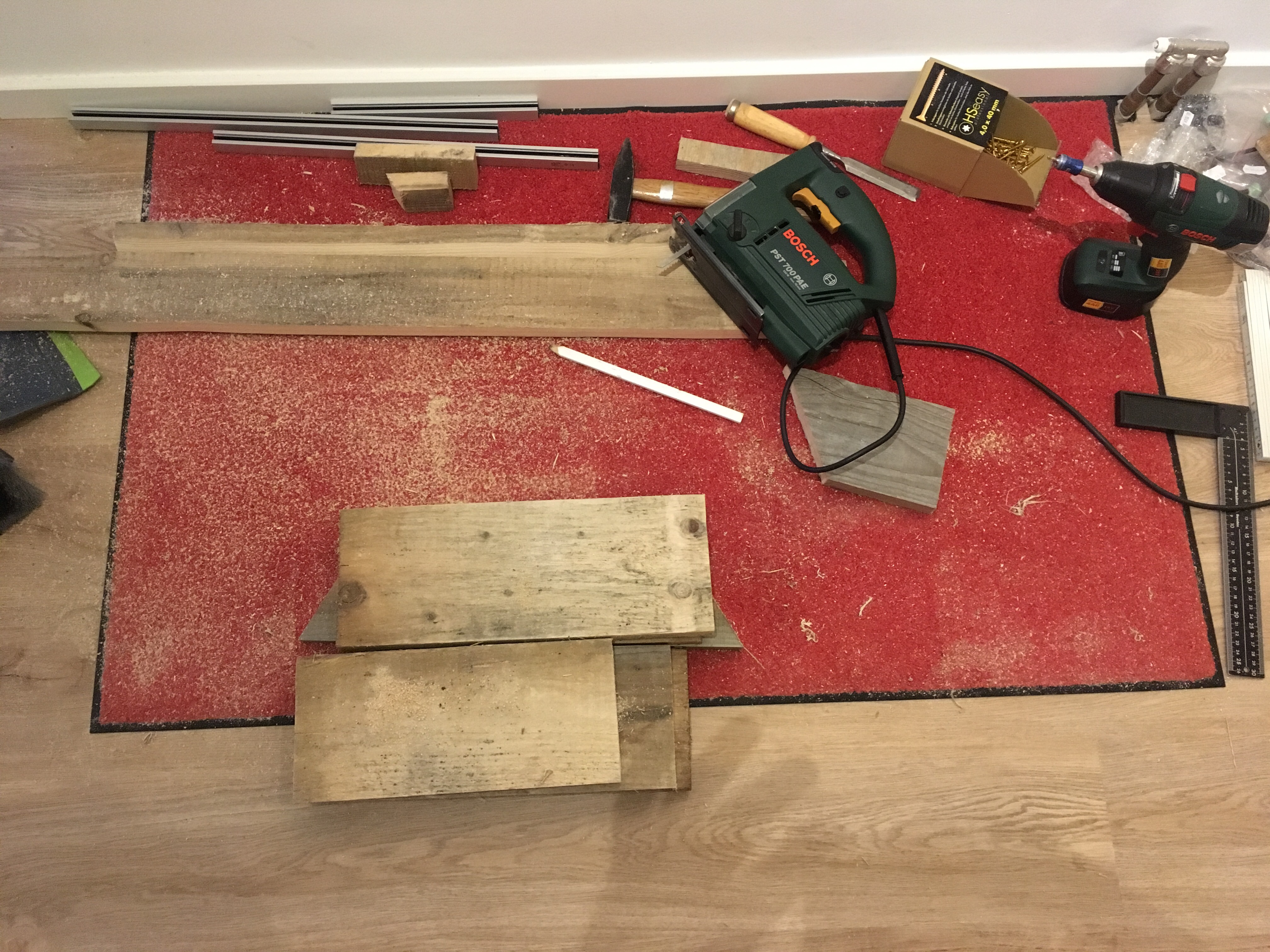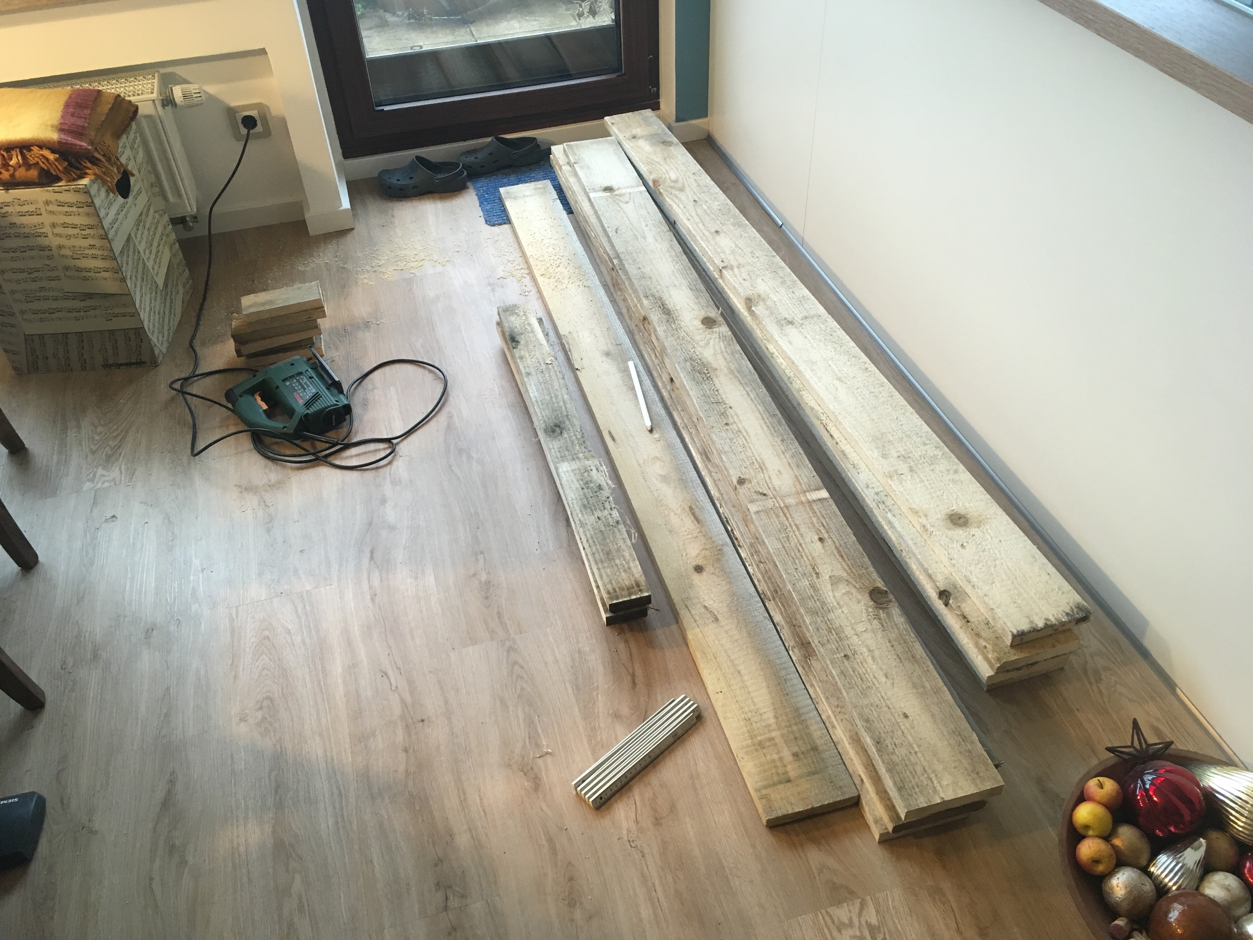 Bausatz für Große… Das ehemalige Podest aus Jakobs Zimmer wird in eine neue Form gebracht. Jetzt noch schnell zum Baumarkt, dann folgt der Probeaufbau.