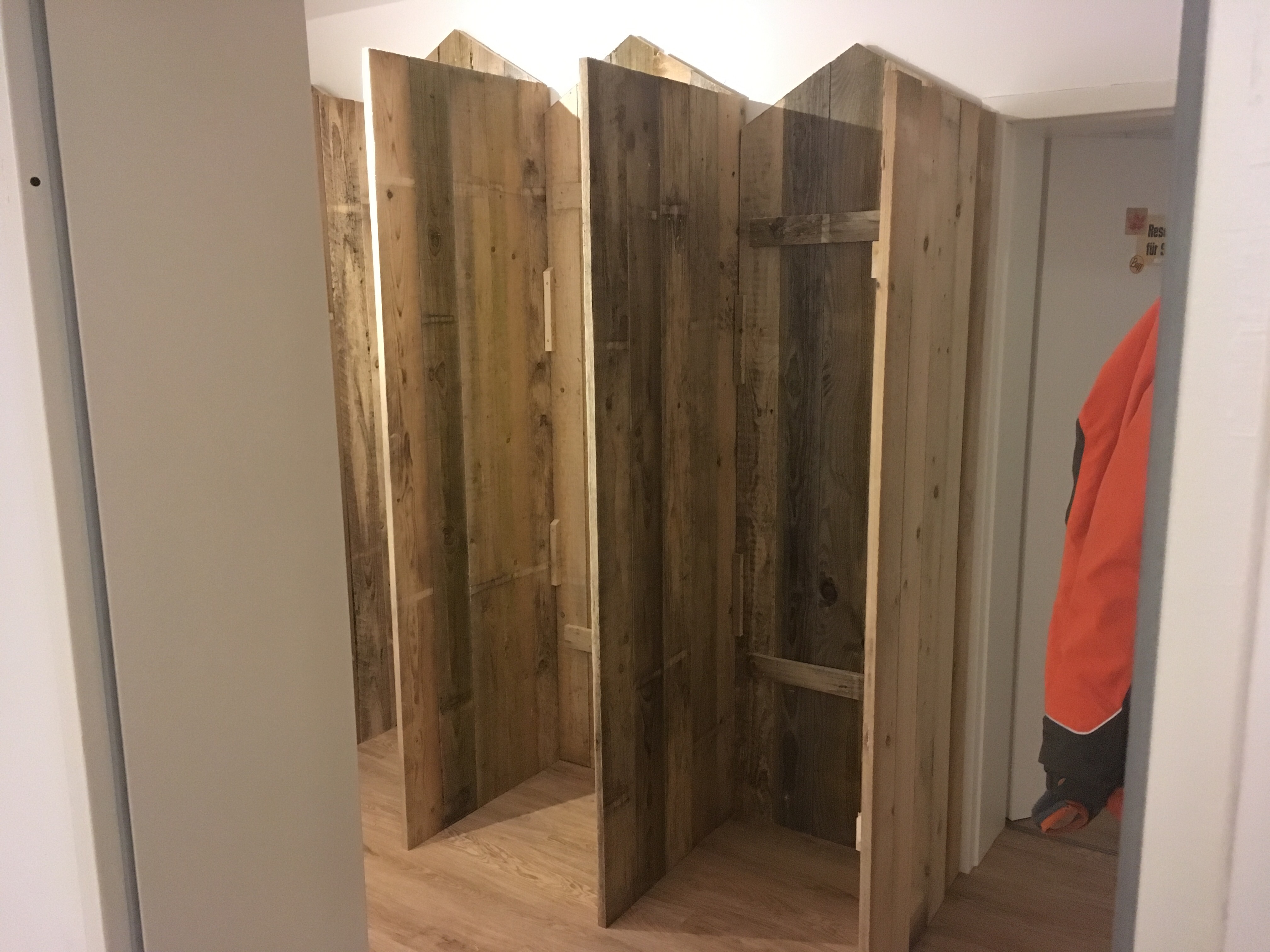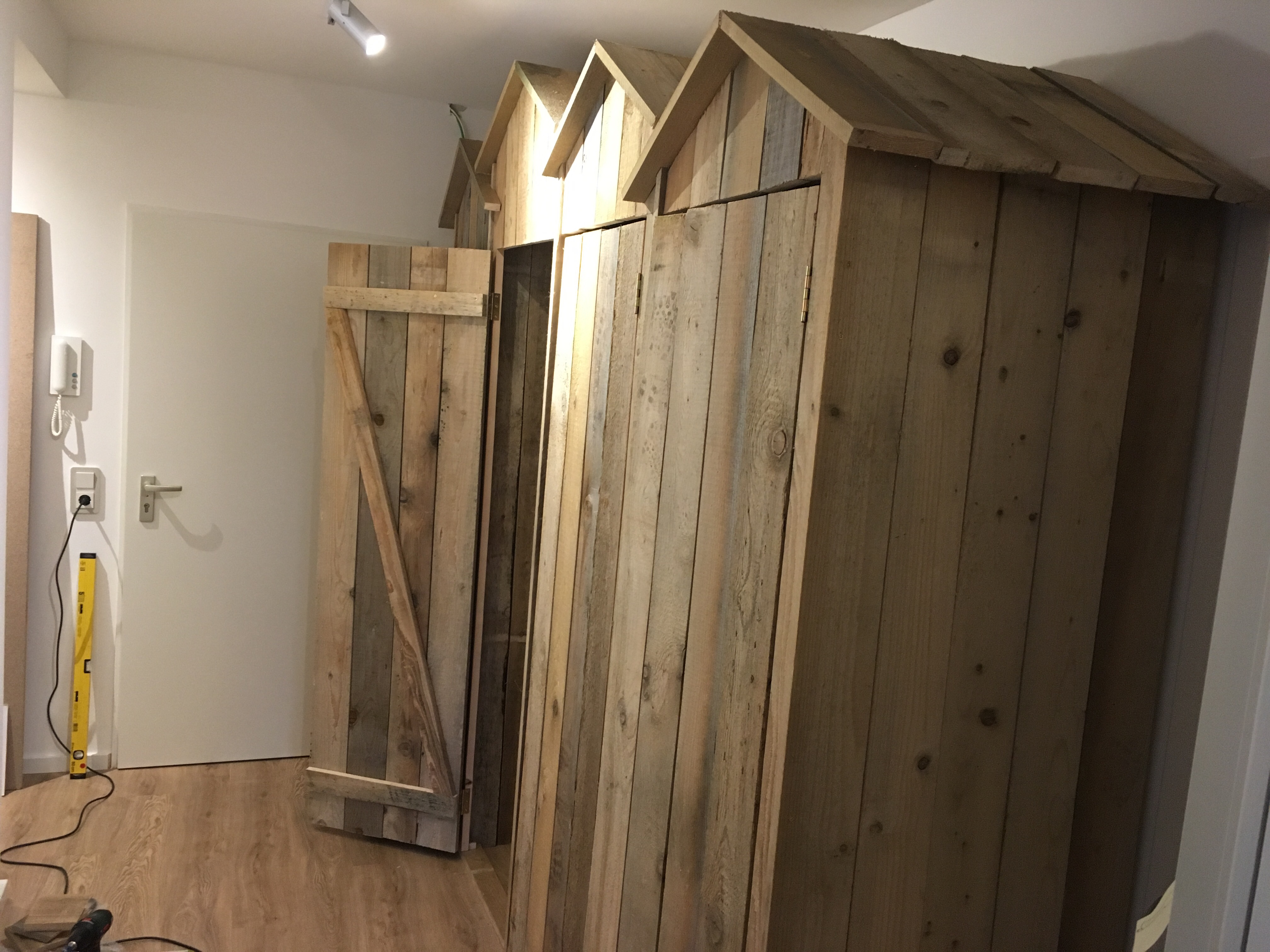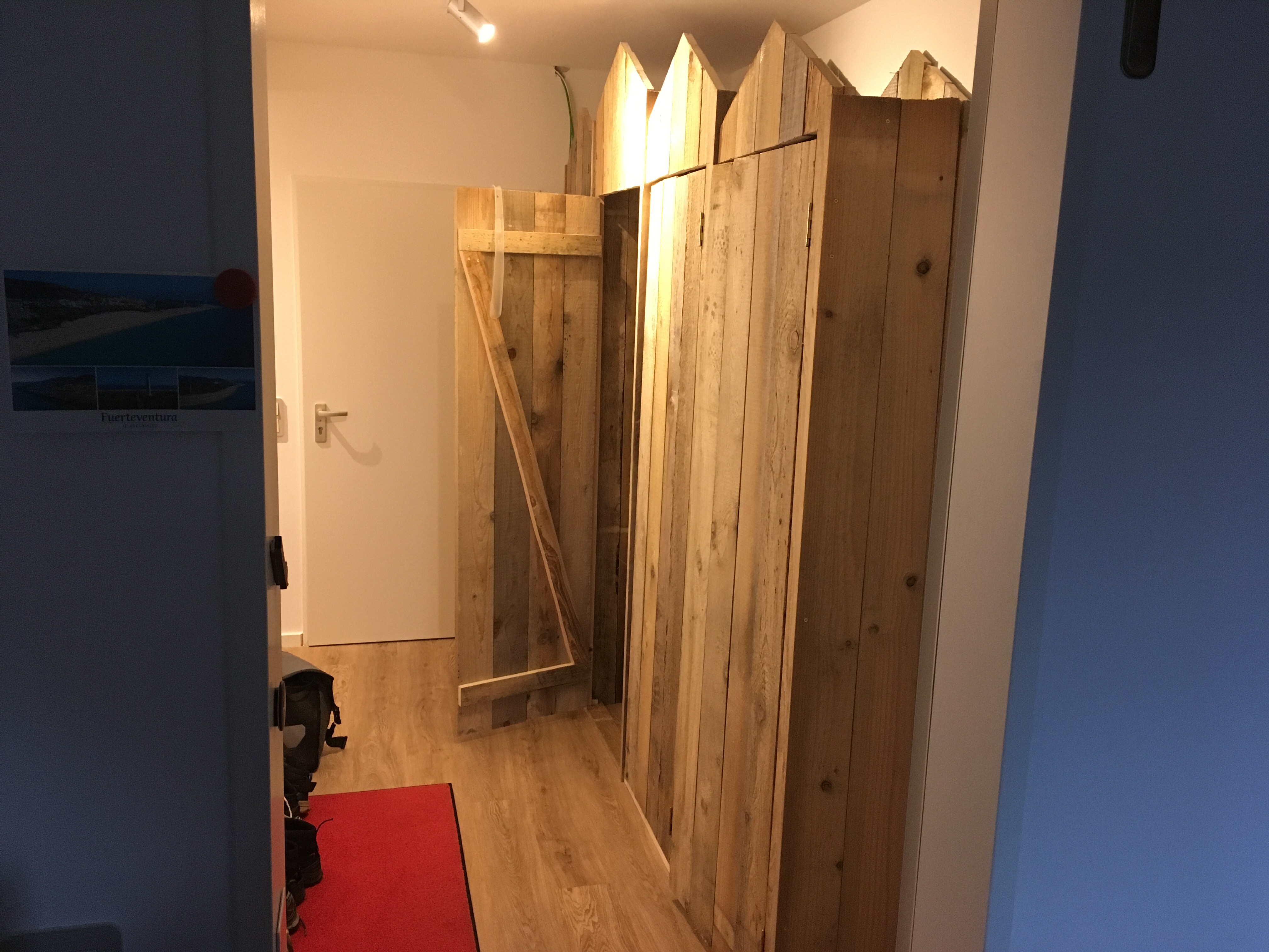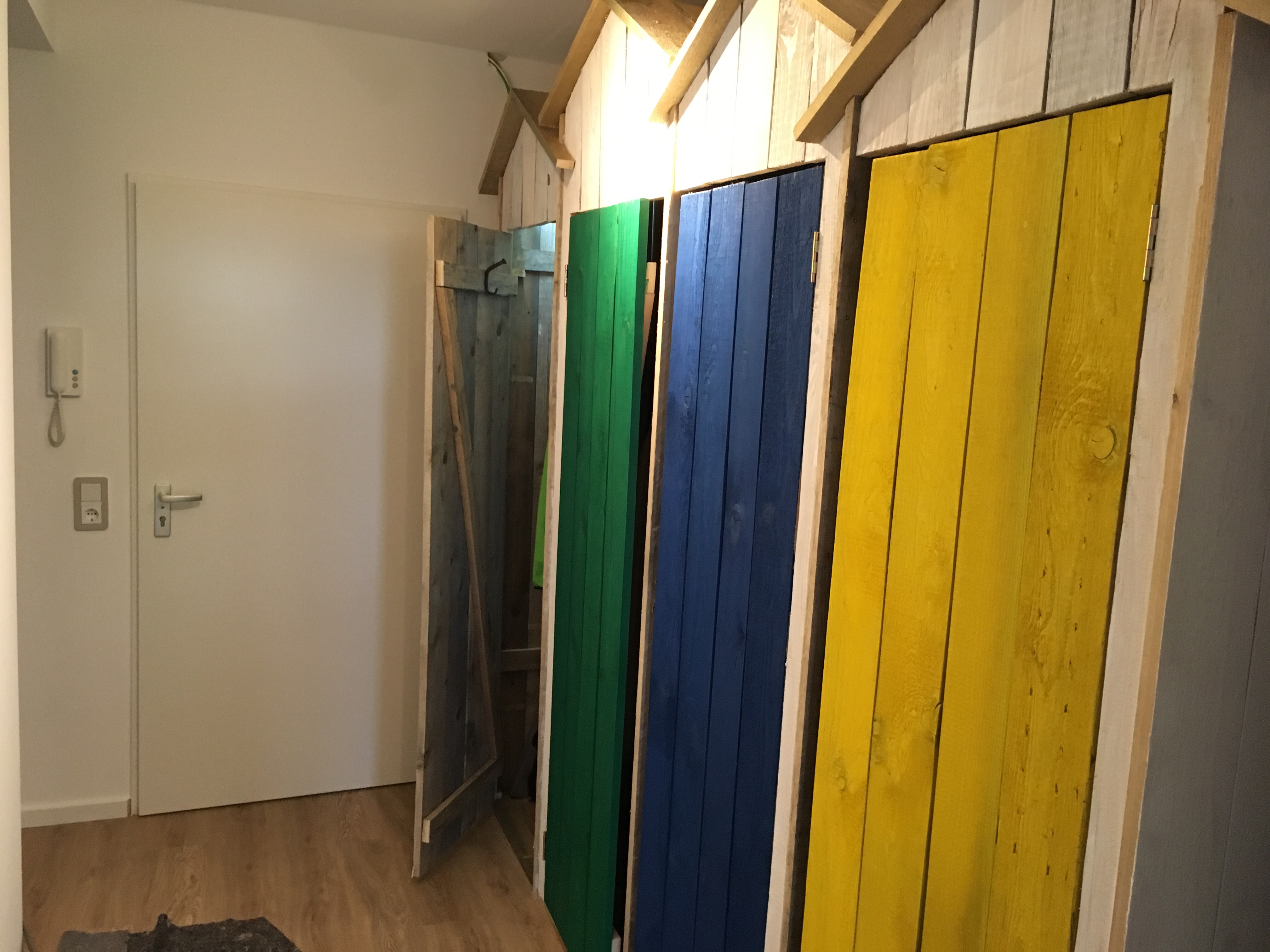 Wir haben begonnen, unsere „Strandhütten“ im Flur zu bauen. Sie werden später vier Garderobenschränke für je ein Familienmitglied bilden.
