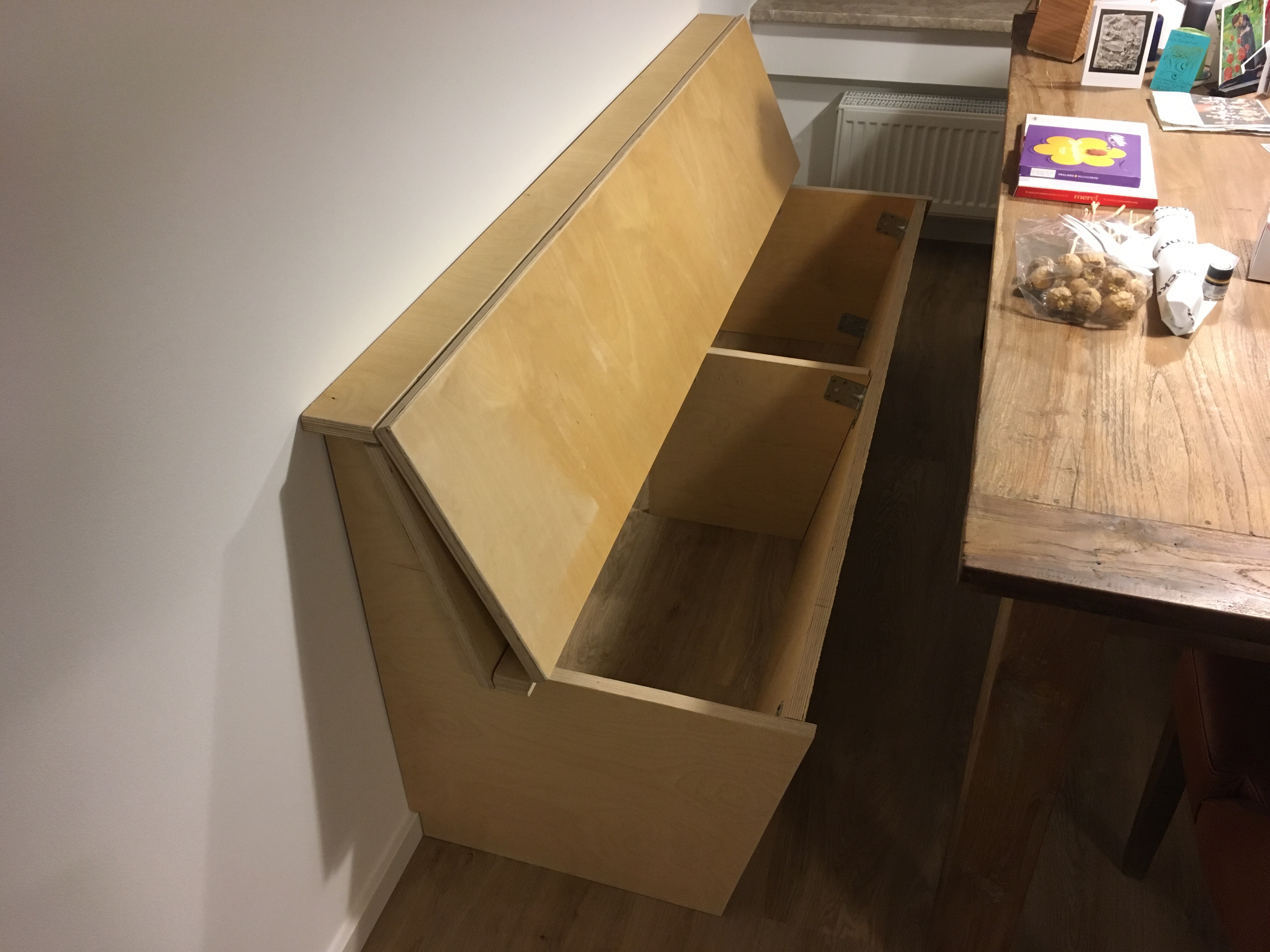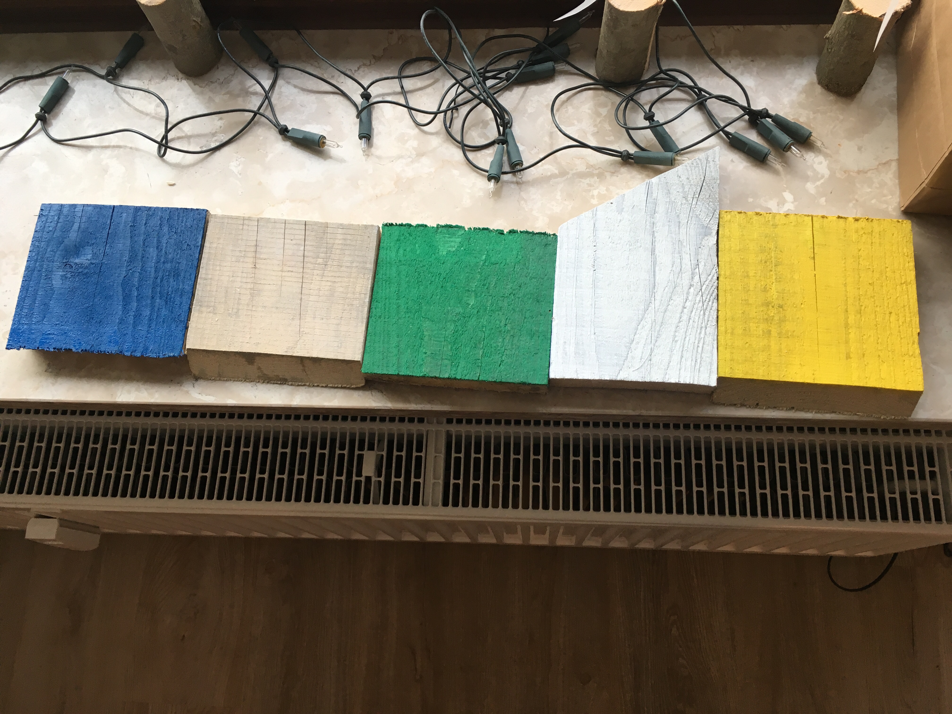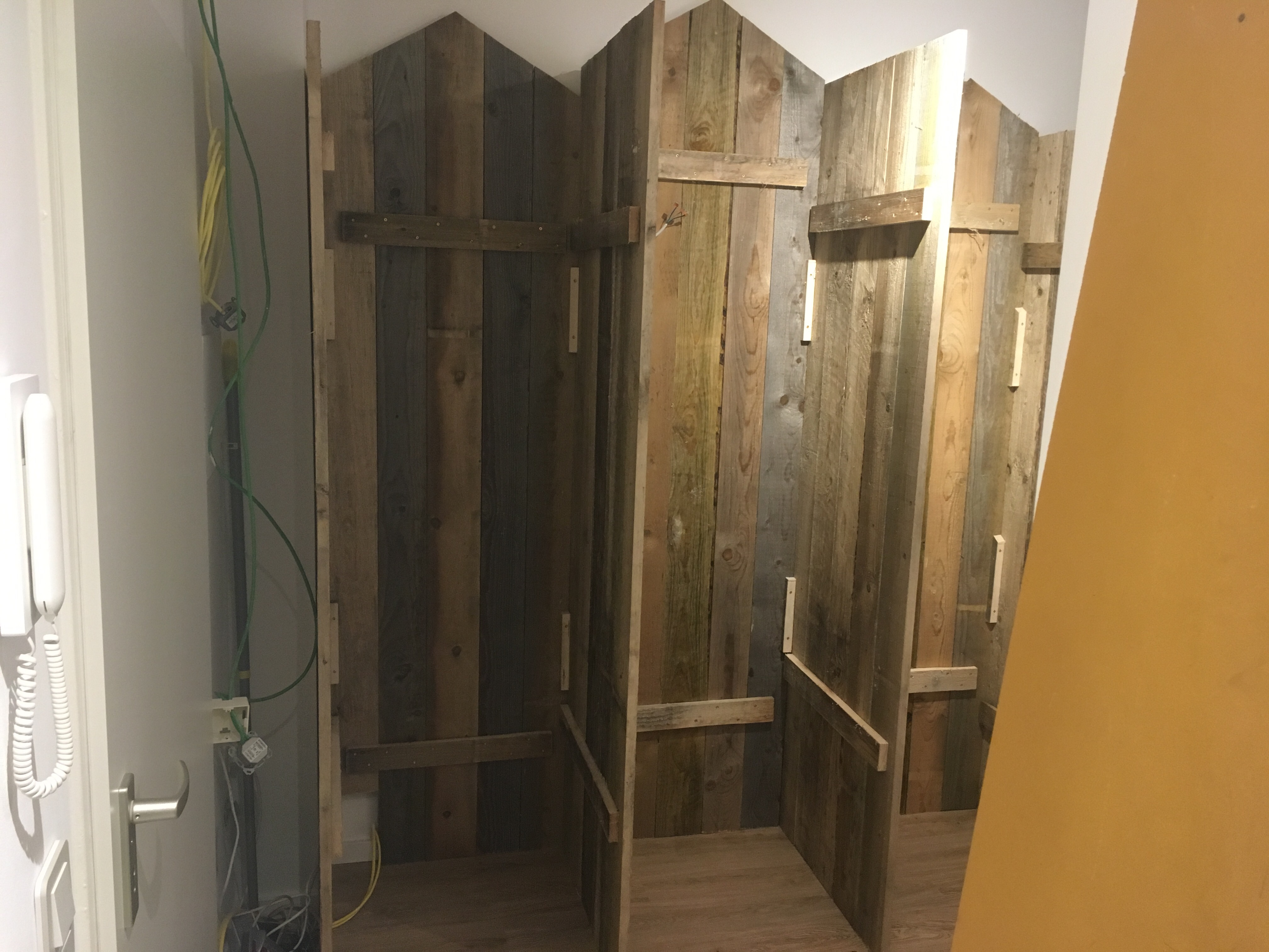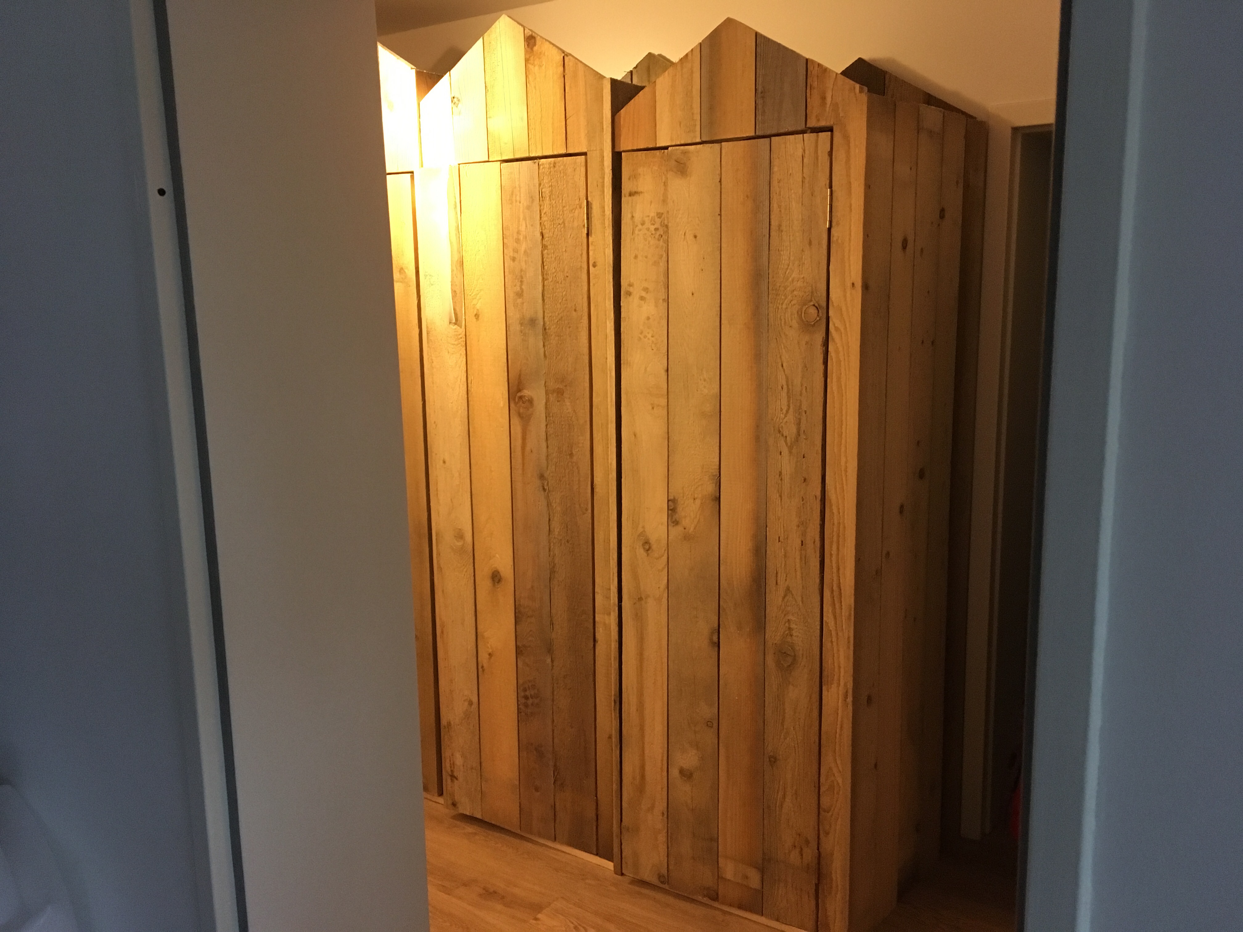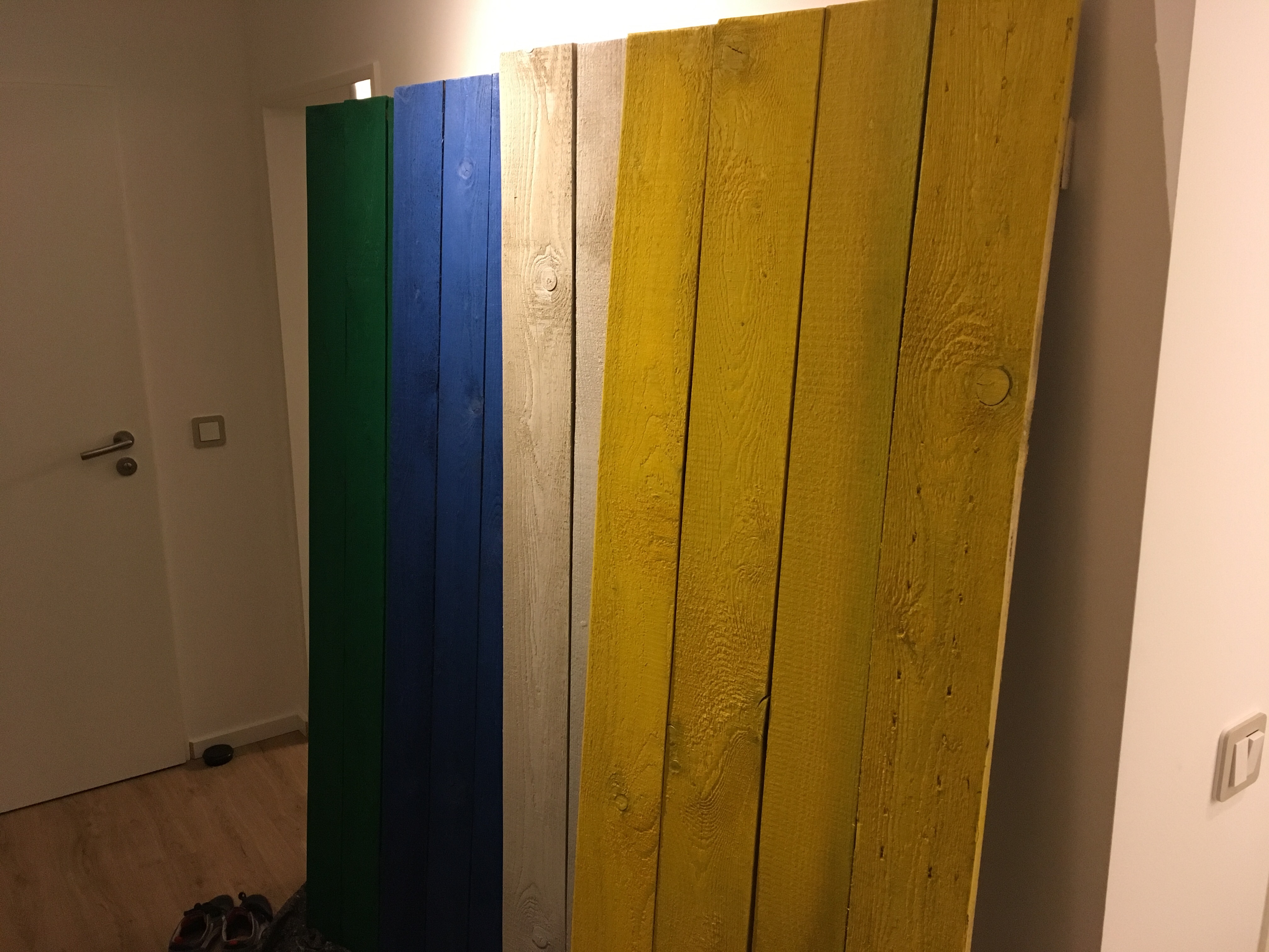 Wir haben begonnen, unsere „Strandhütten“ im Flur zu bauen. Sie werden später vier Garderobenschränke für je ein Familienmitglied bilden.