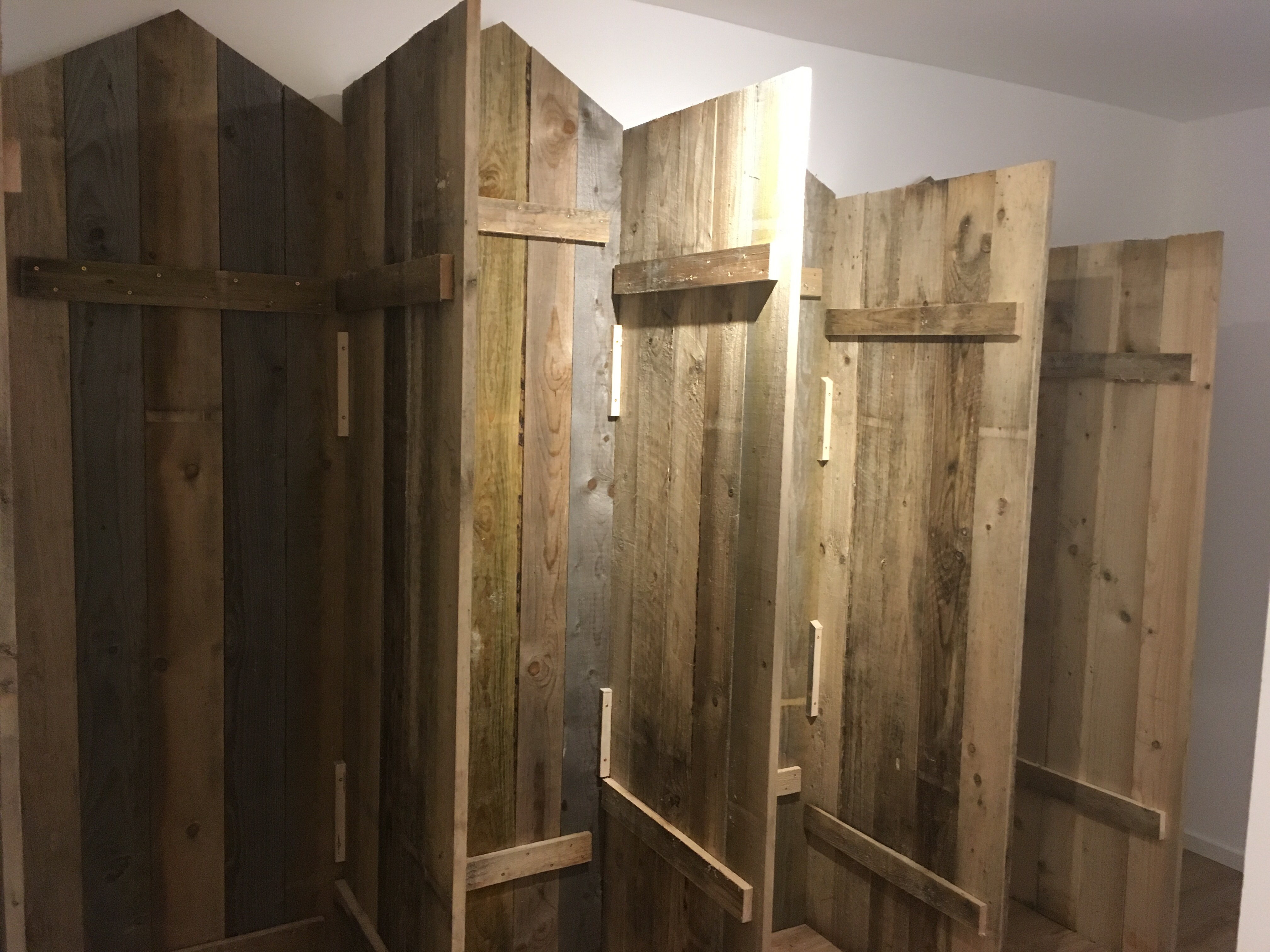 Die Buden wurden noch einmal ausgerichtet, da sie sich in der Heizungsluft etwas verzogen hatten. Jetzt sind die Fronten und Türen fertig. Fehlen noch die Dächer und der Innenausbau.