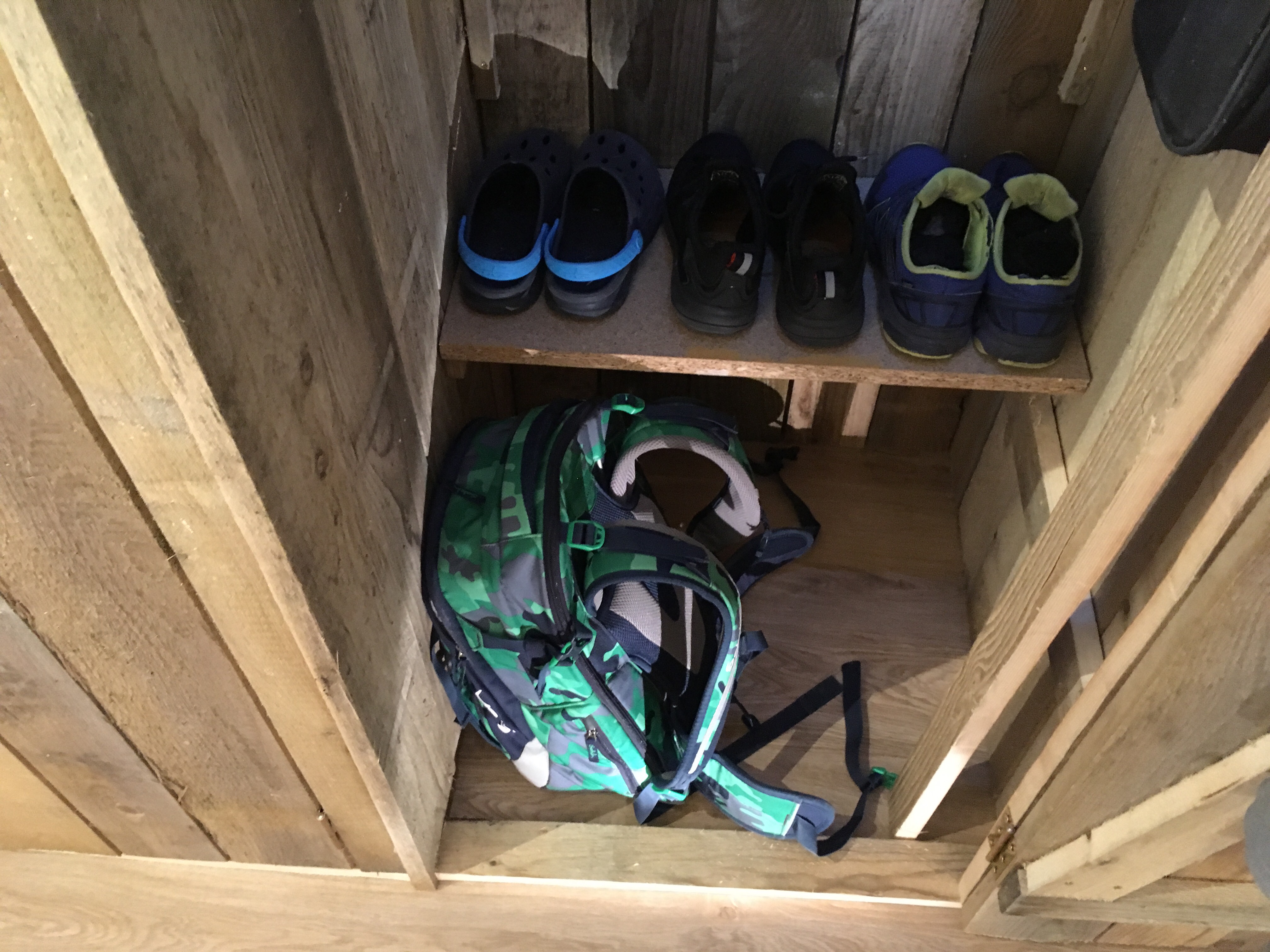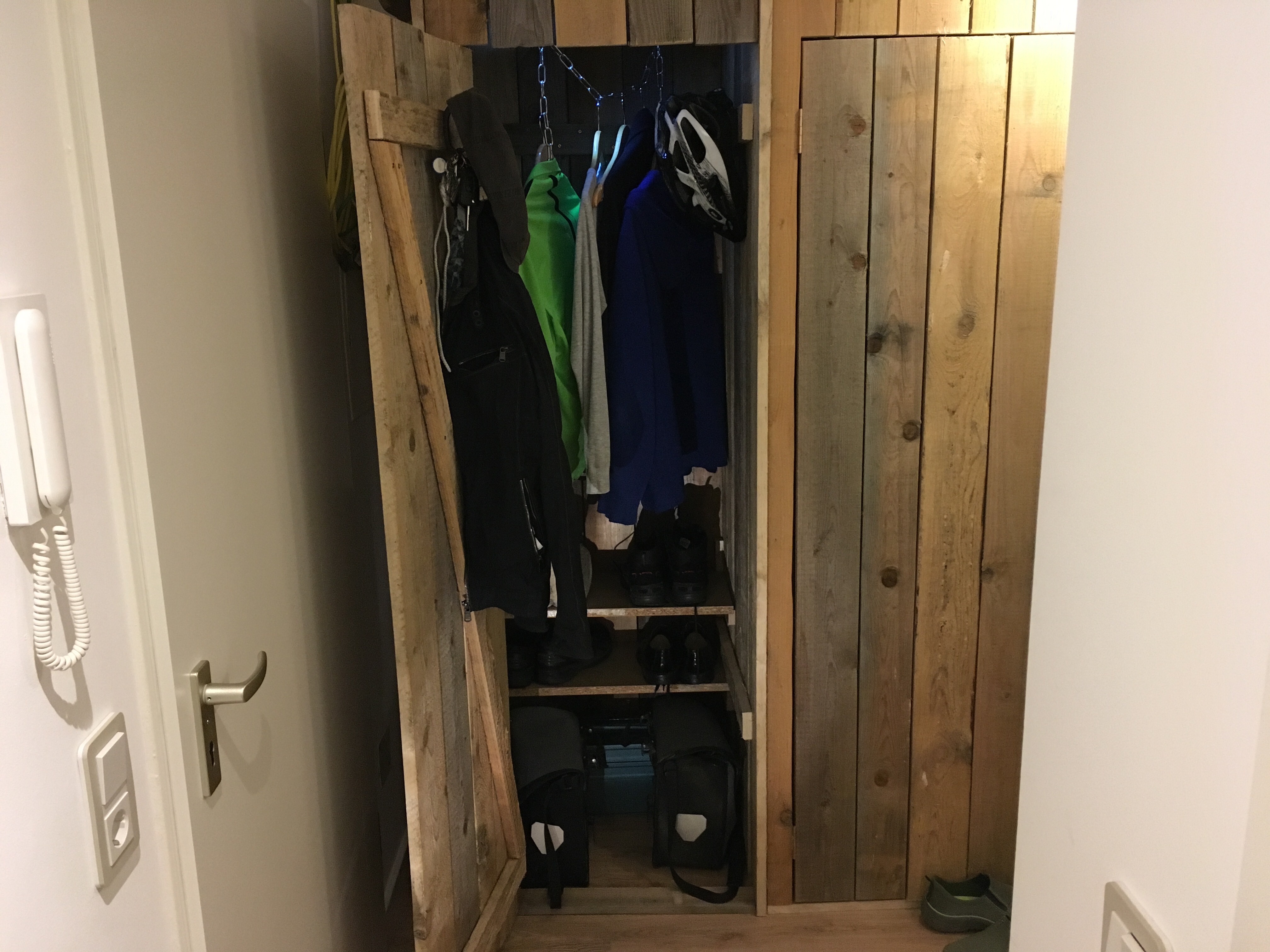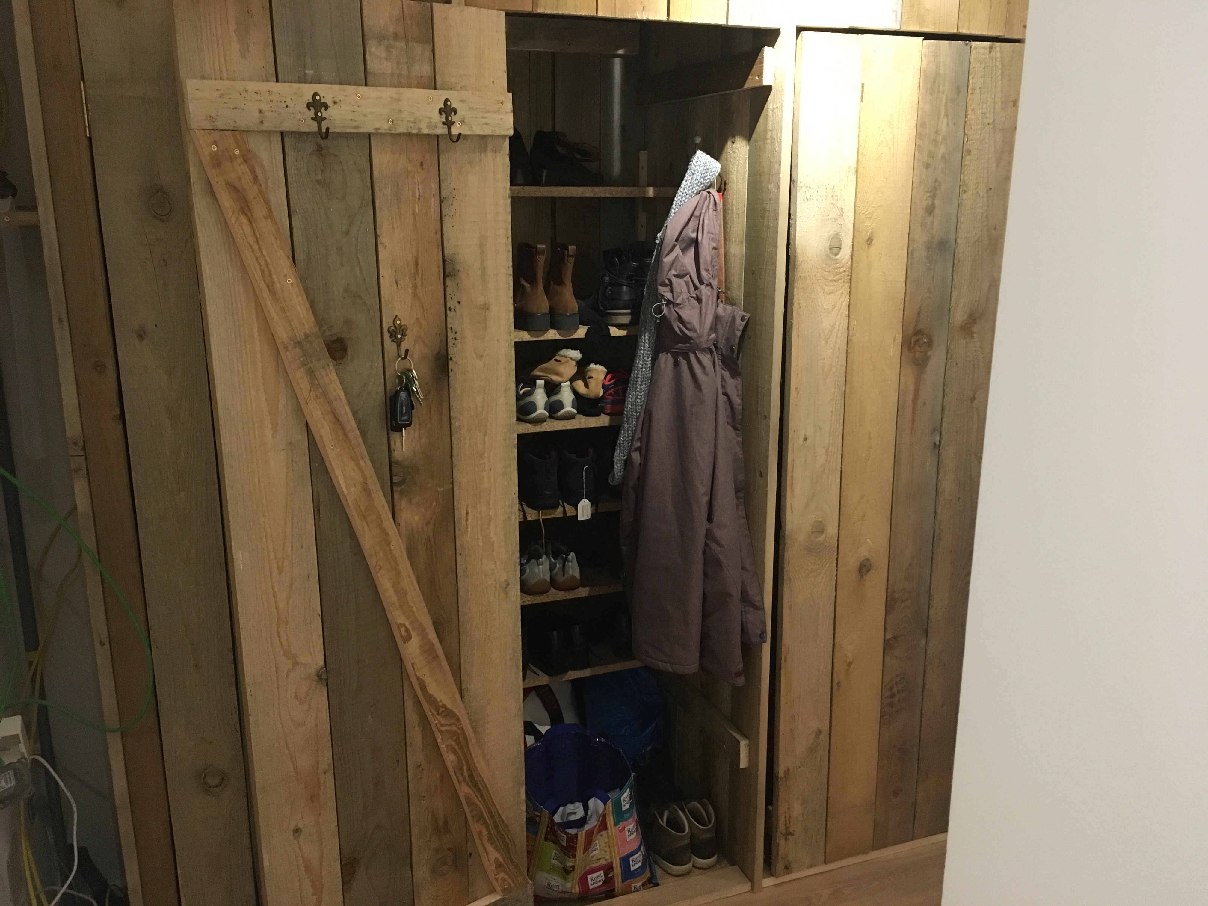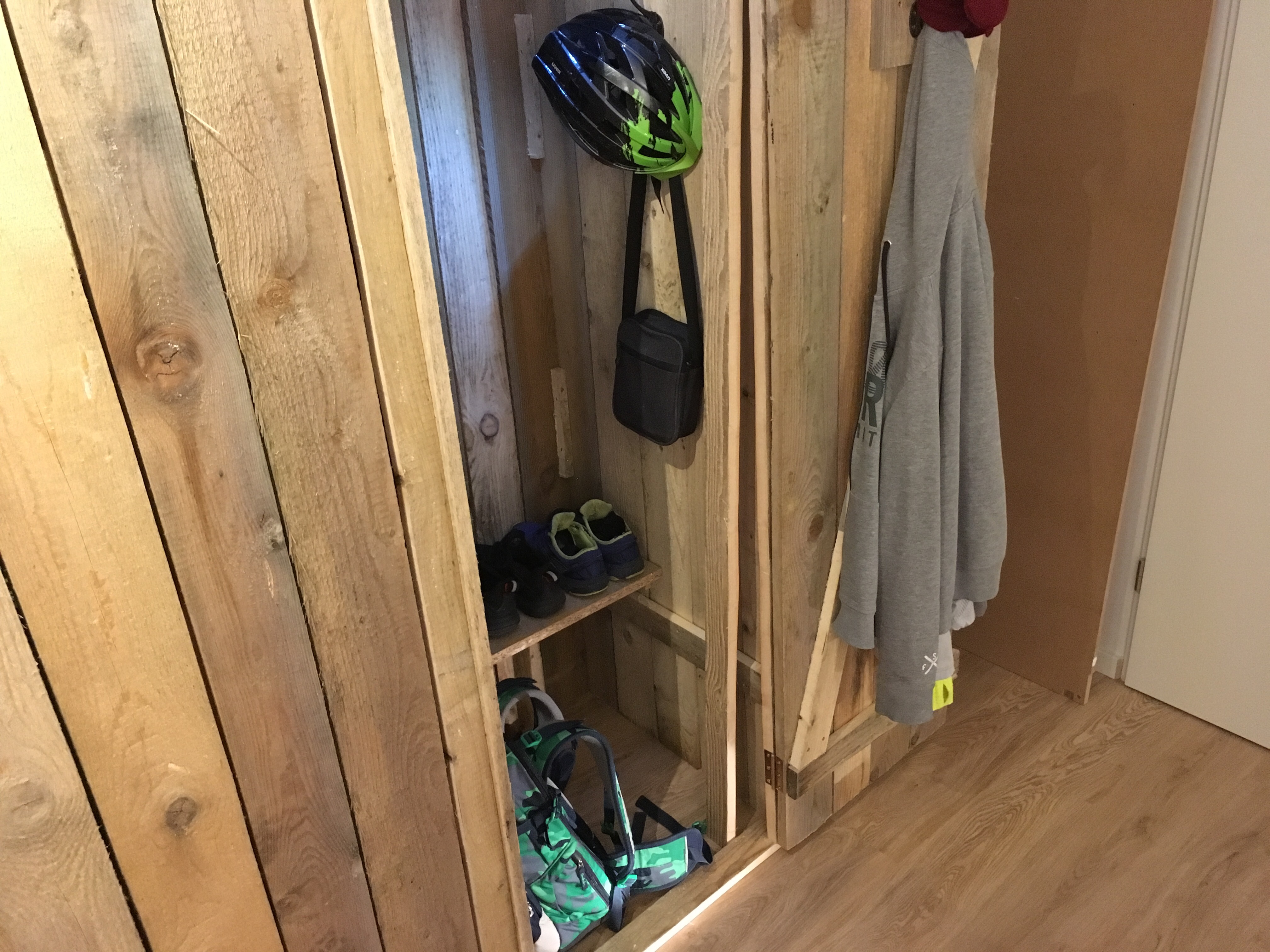 Der Innenausbau der Dielenschränke schreitet voran. Ich habe mir eine Garderobe aus einer Kette gebaut und Jakob hat schon einmal festgelegt, wie seine Jacken hängen und seine erste Lage Schuhe stehen sollen.