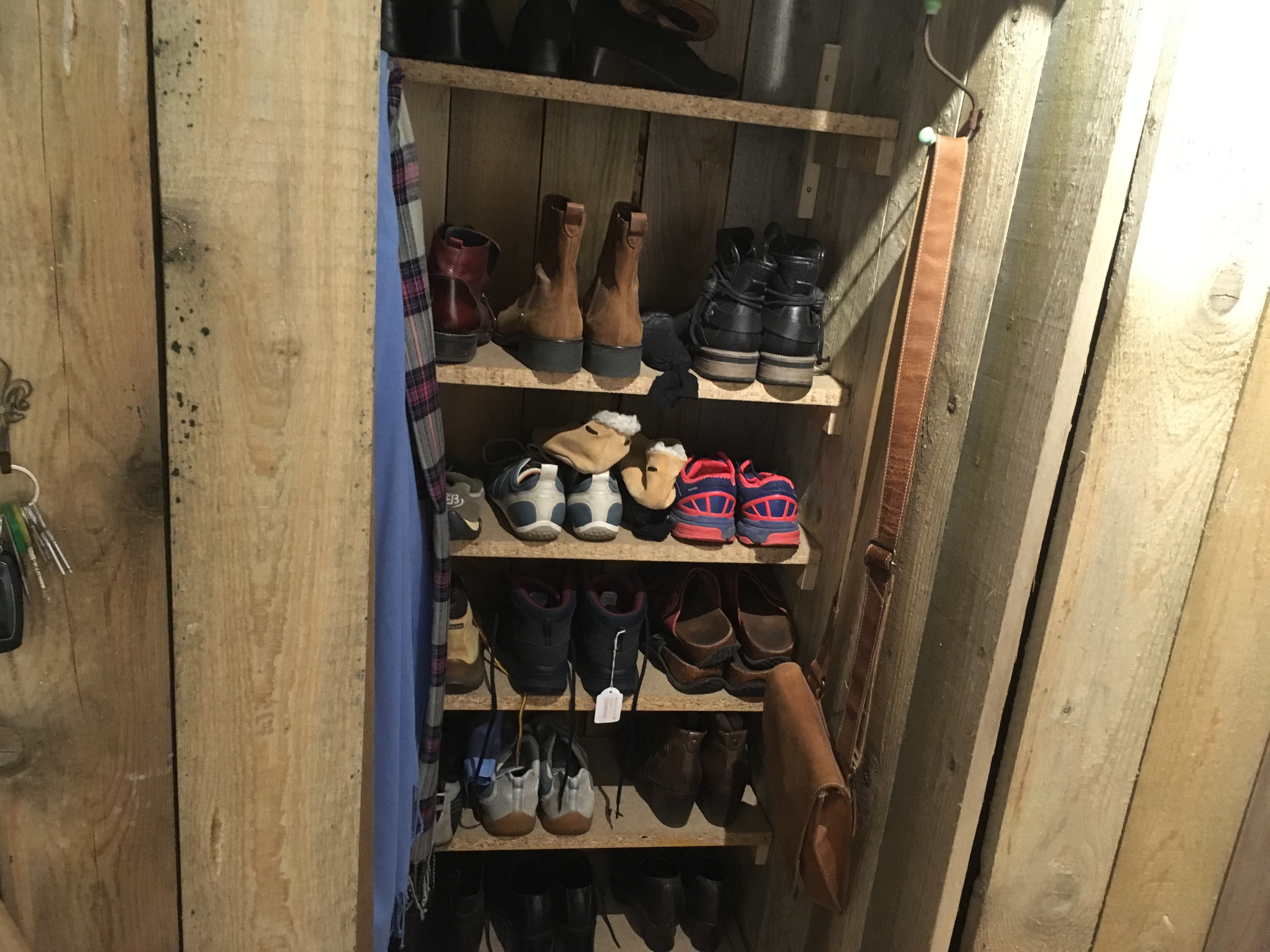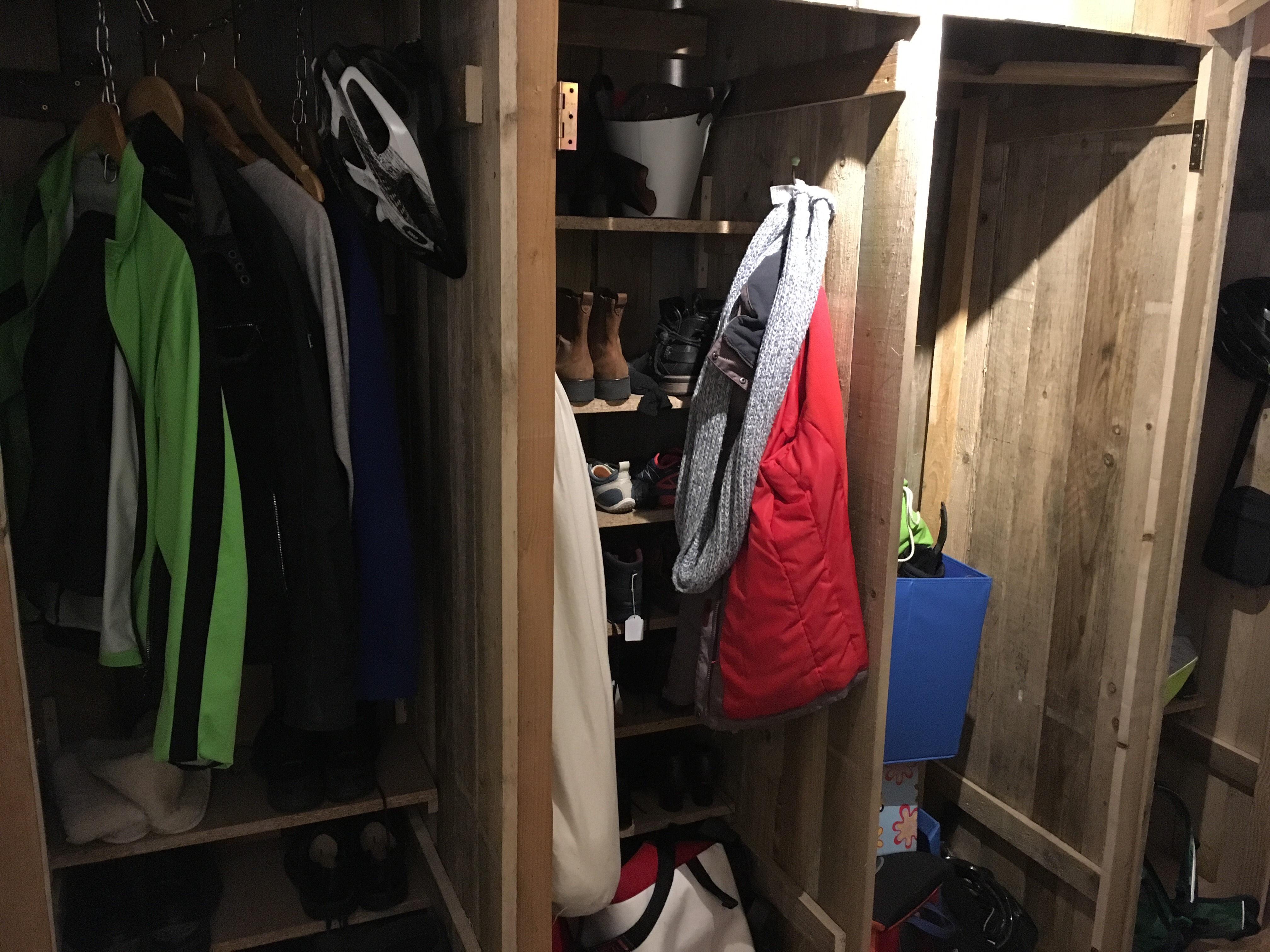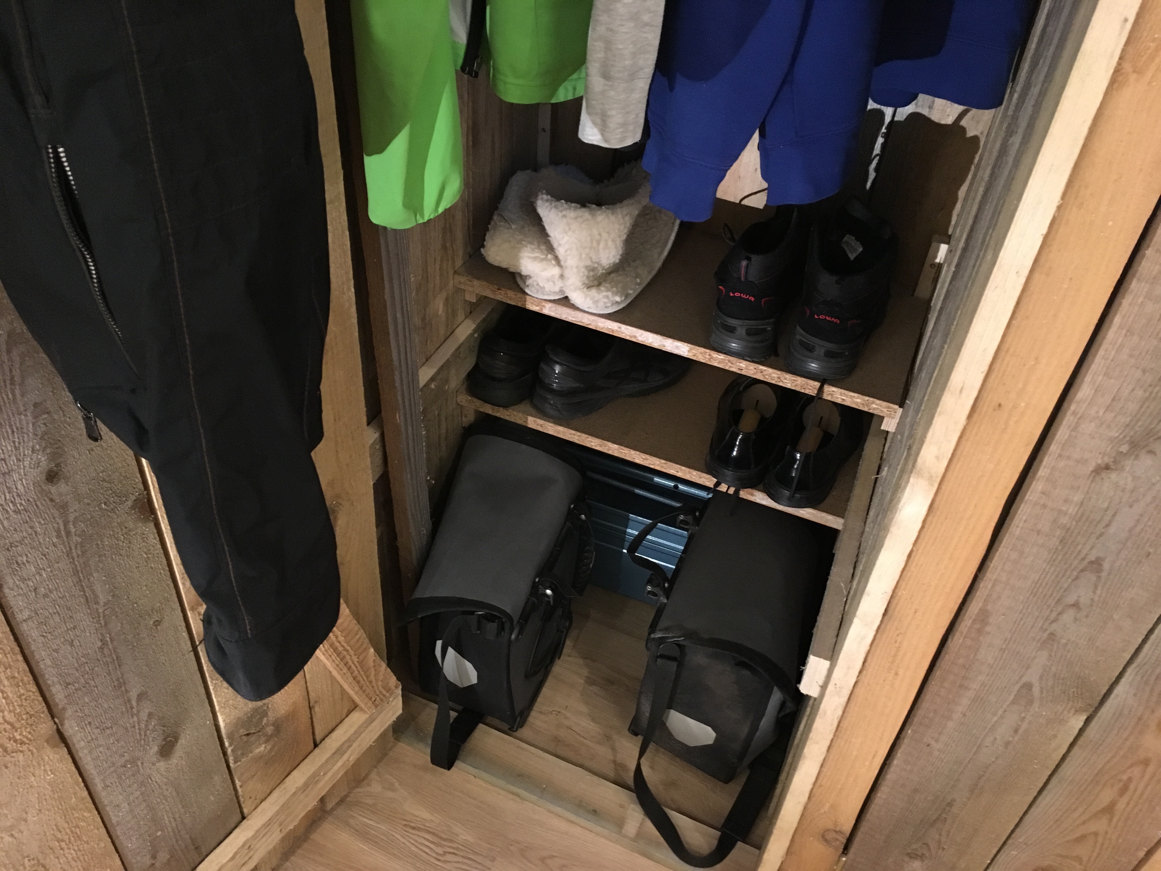 Der Innenausbau der Dielenschränke schreitet voran. Ich habe mir eine Garderobe aus einer Kette gebaut und Jakob hat schon einmal festgelegt, wie seine Jacken hängen und seine erste Lage Schuhe stehen sollen.