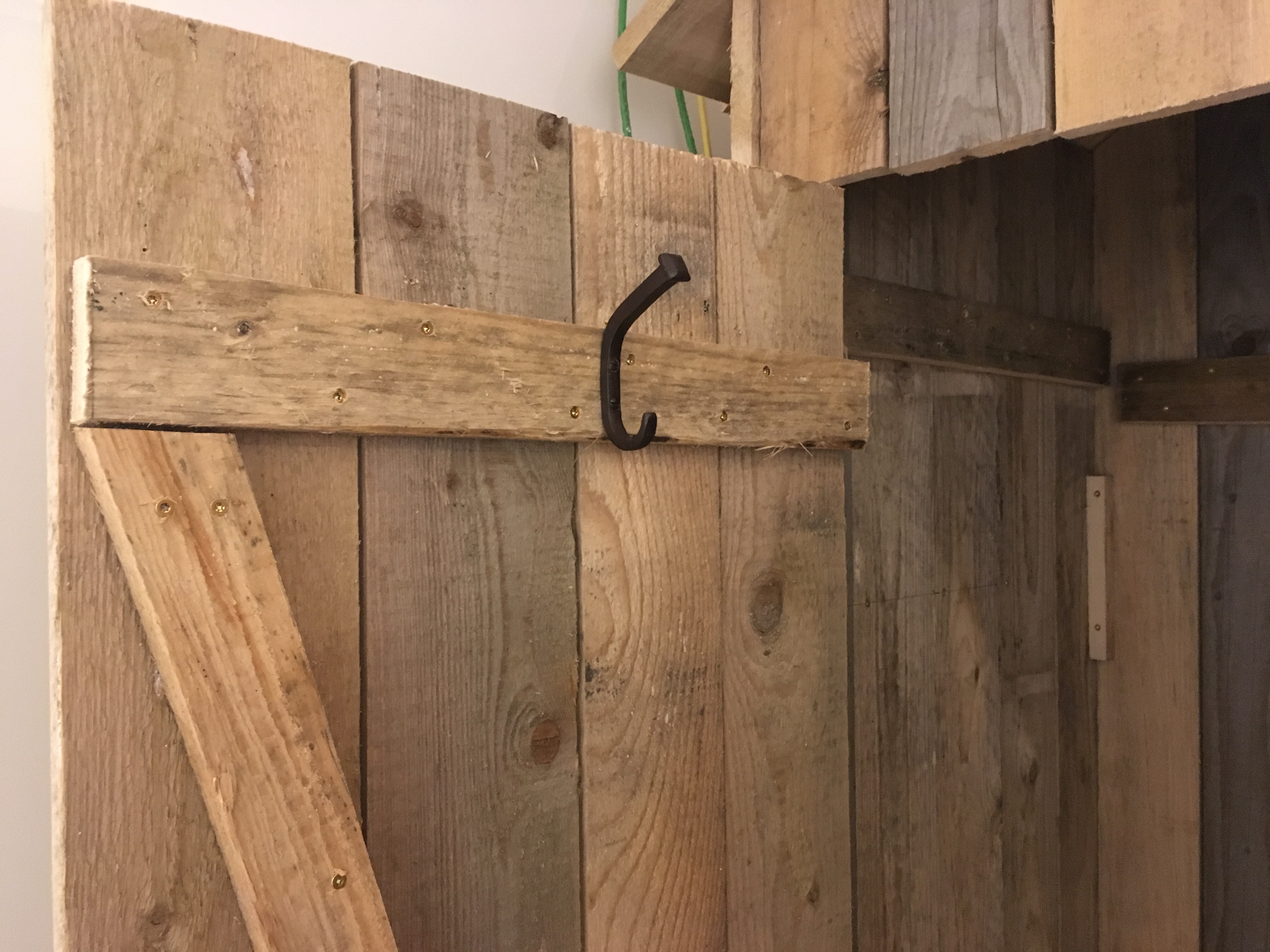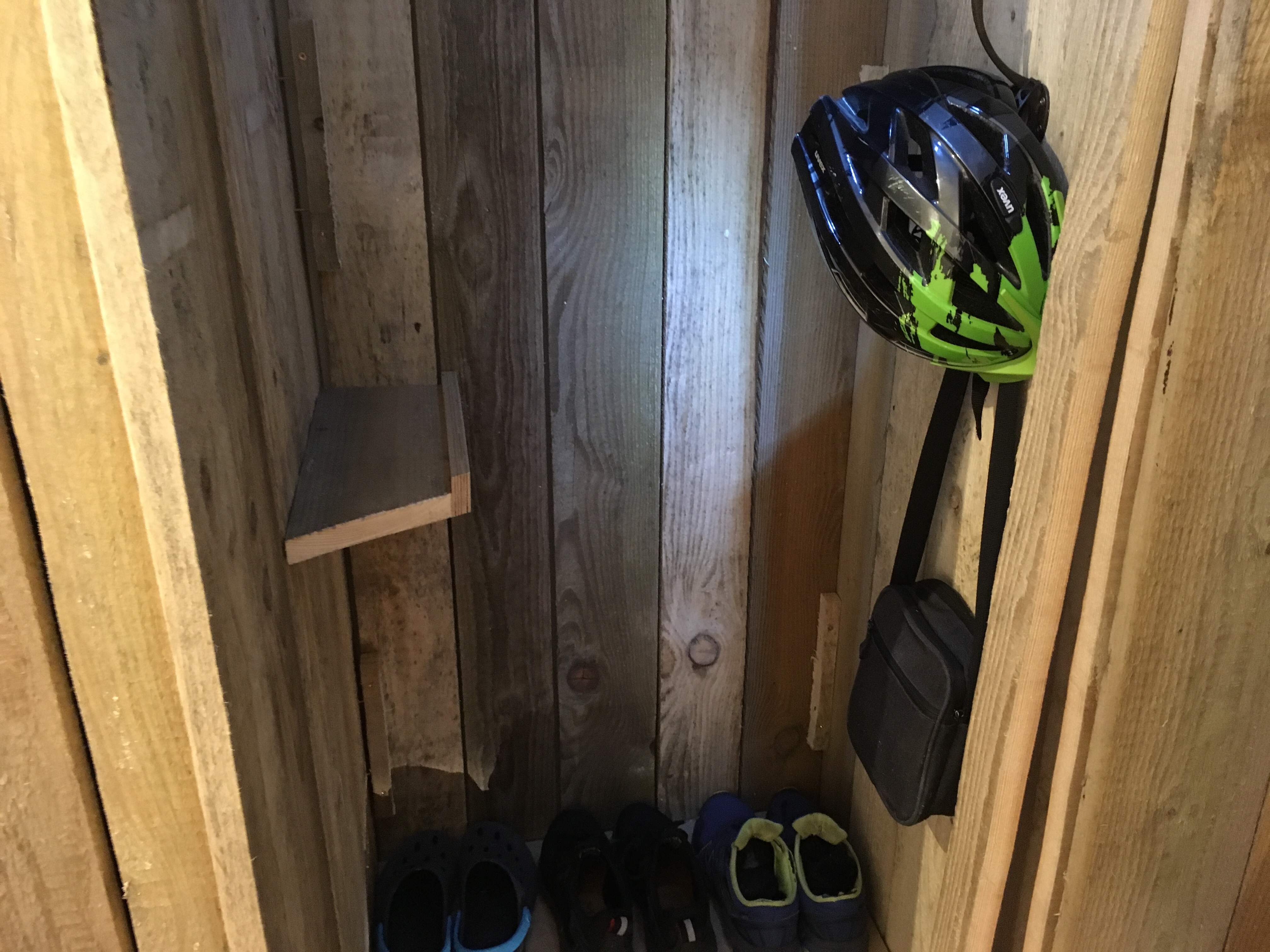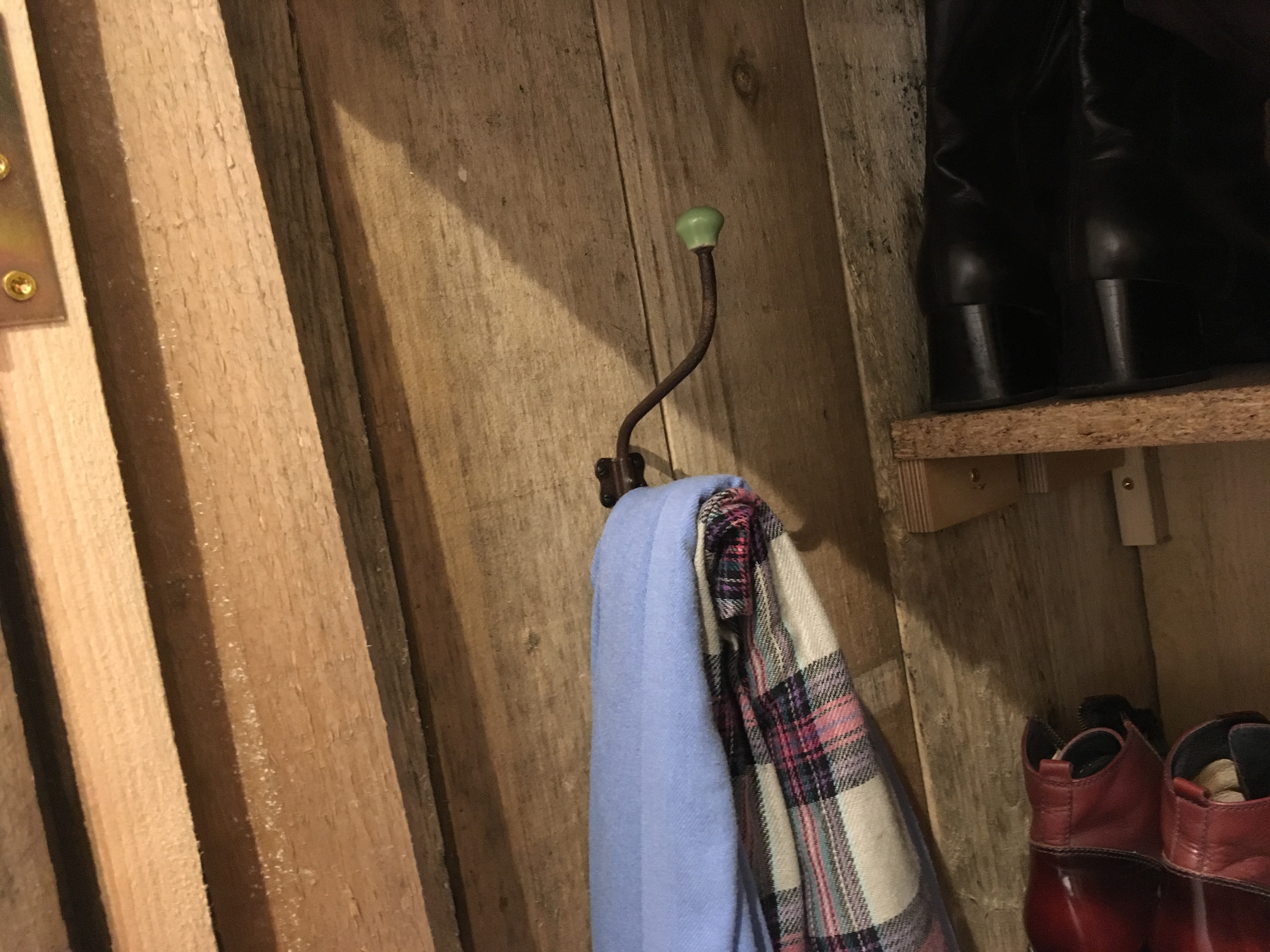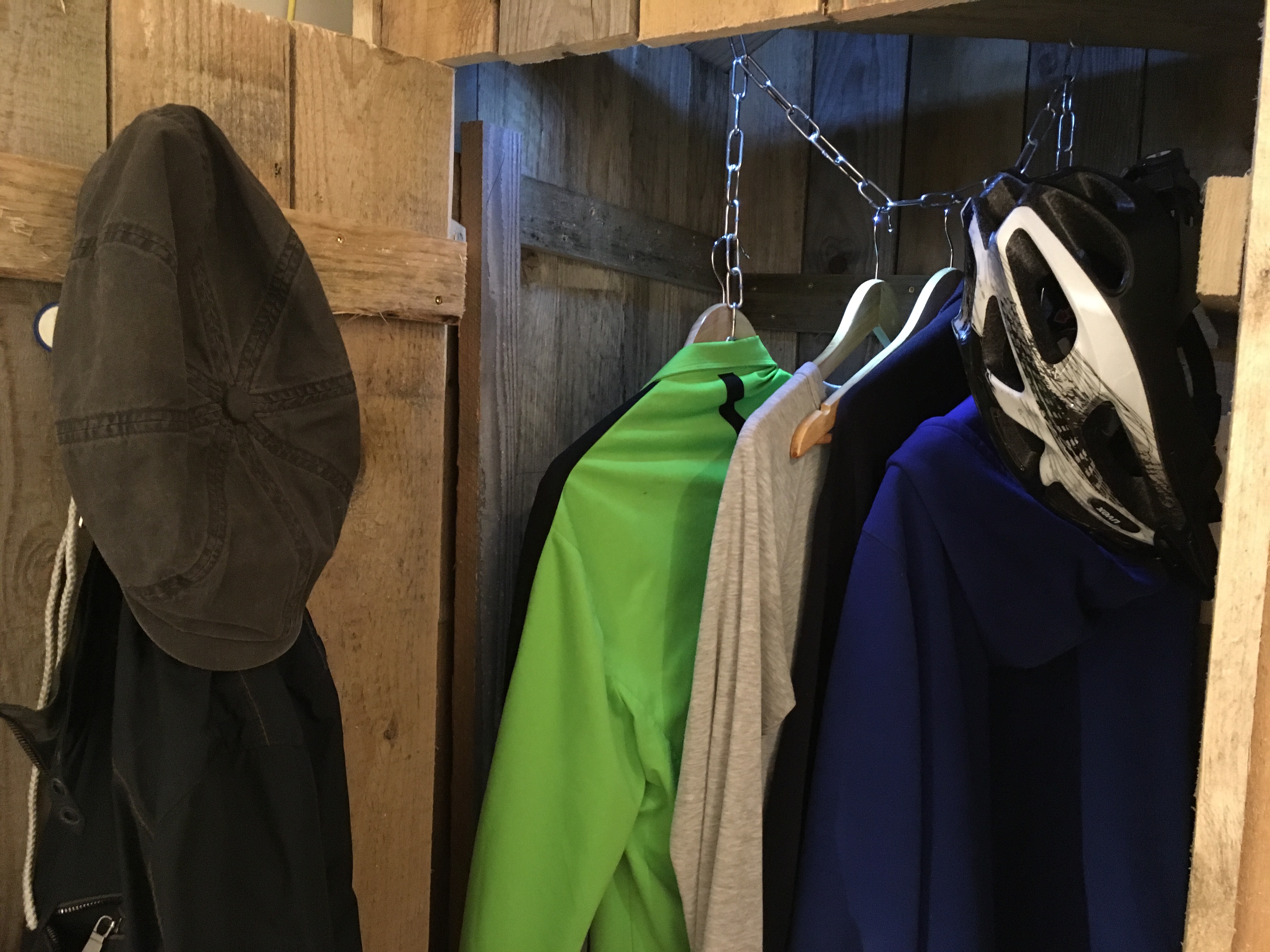 Der Innenausbau der Dielenschränke schreitet voran. Ich habe mir eine Garderobe aus einer Kette gebaut und Jakob hat schon einmal festgelegt, wie seine Jacken hängen und seine erste Lage Schuhe stehen sollen.