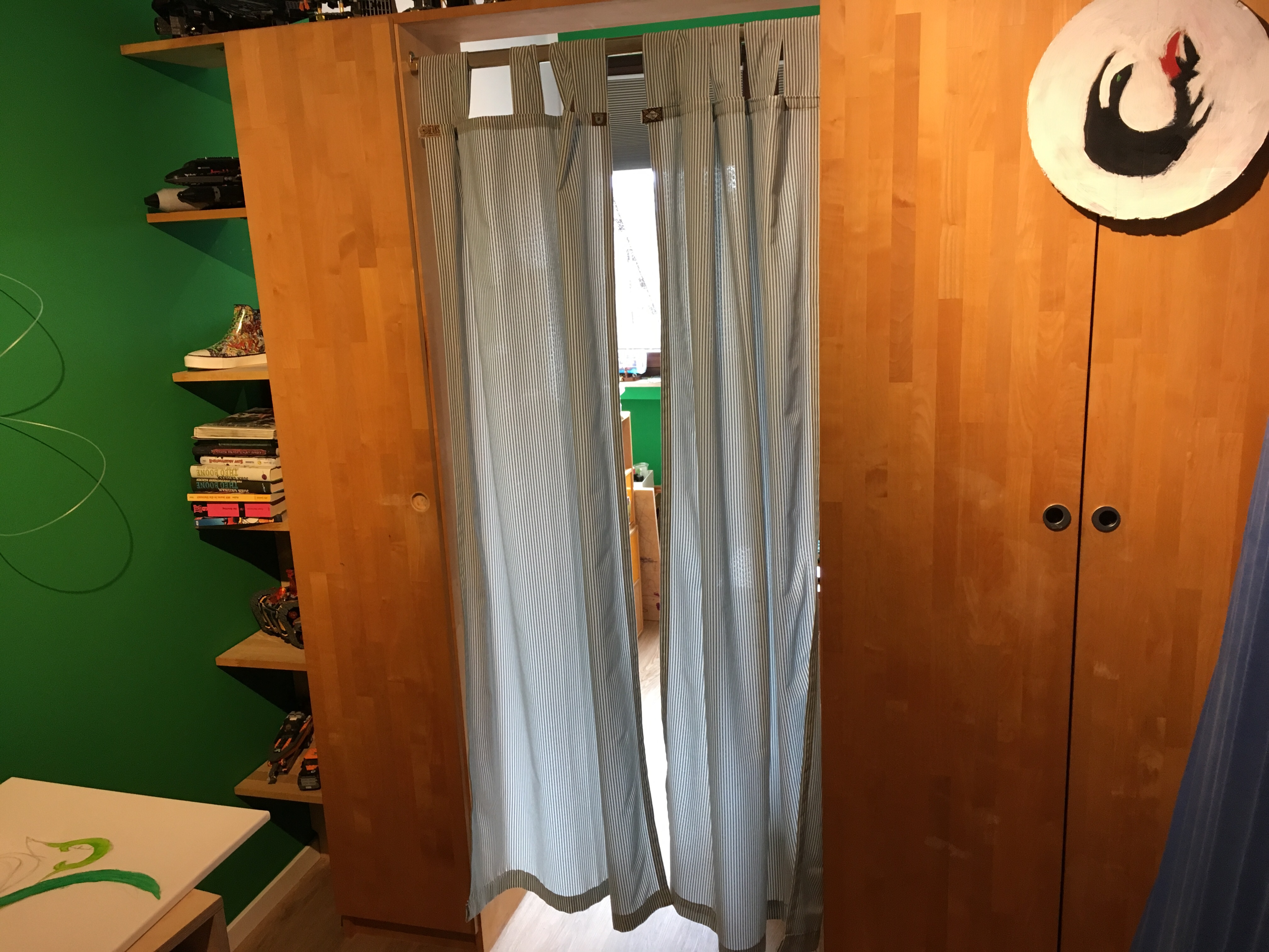 Jakob hat einen Vorhang für seinen Raumtrenner geschenkt bekommen. Passt perfekt.